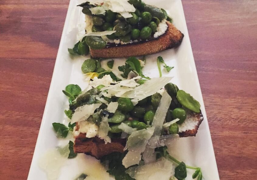 pea and fava bean crostini with mint and edible flowers