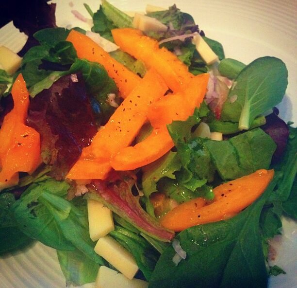 favorite salad du jour: shallots, yellow heirloom tomato, mâché, point reyes toma, mixed greens, baby spinach, olive oil and vinegar