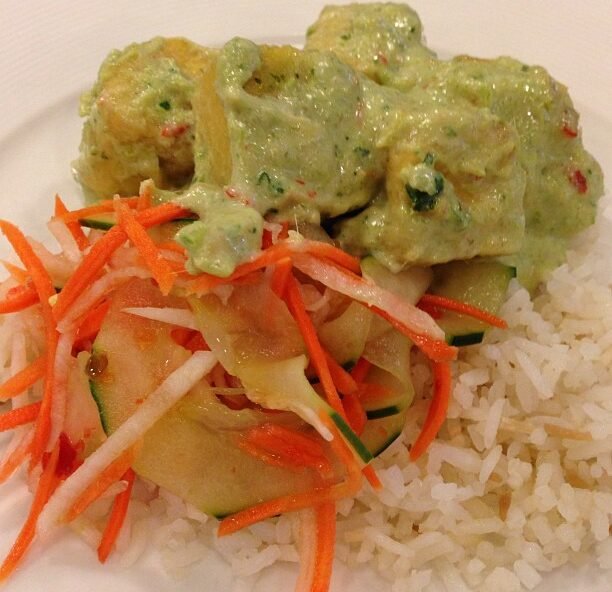 coconut tofu with pickled cucumber, carrot and daikon salad