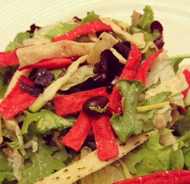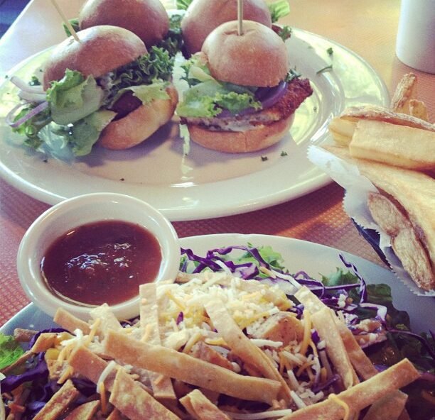 veggie chicken sliders, santa fe salad and fries mmm